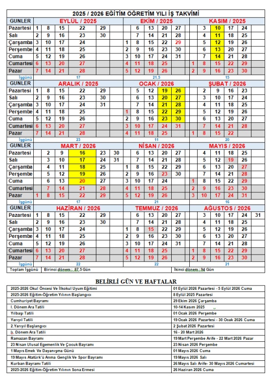 2025-2026 EĞİTİM VE ÖĞRETİM YILI ÇALIŞMA TAKVİMİ